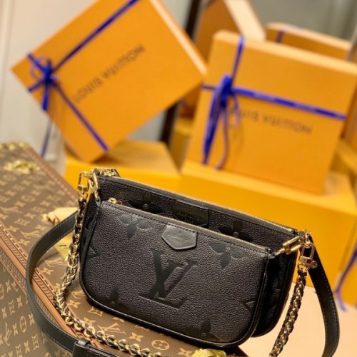 M57631 블랙 멀티 포쉐트 악세수아 핸드백은 3피스를 하나로 제작했으며, 여러 개의 포켓과 수납층을 갖추고 있습니다. 조절 가능한 골드 체인과 루이 비통 비통 자카드 스트랩은 크로스바디 등 다양한 백 스트랩을 제공합니다.