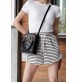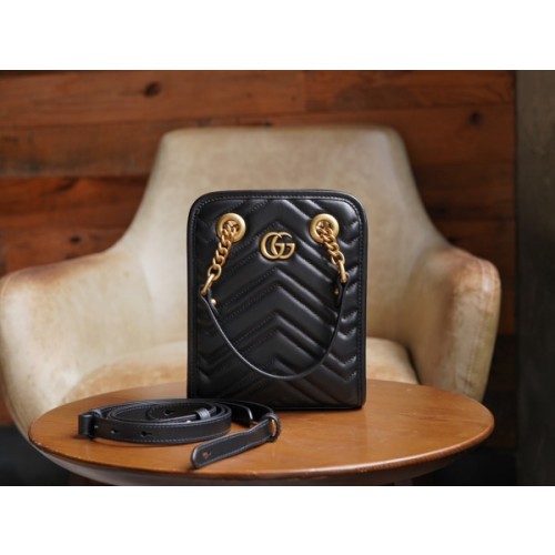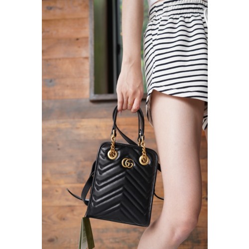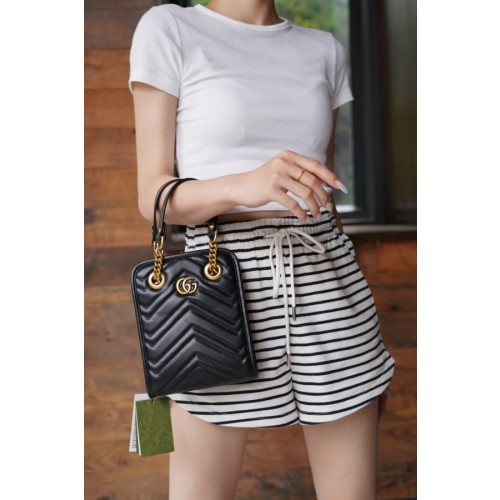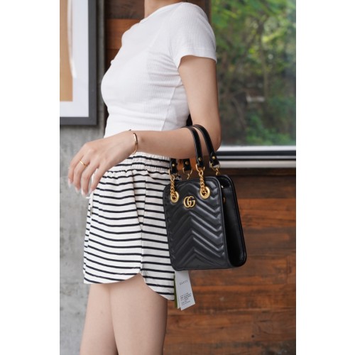 블랙 마틀라세 레더 소재로, 작은 더블 G 메탈 장식으로 완성함. 더블 핸들과 탈부착 가능한 레더 스트랩으로