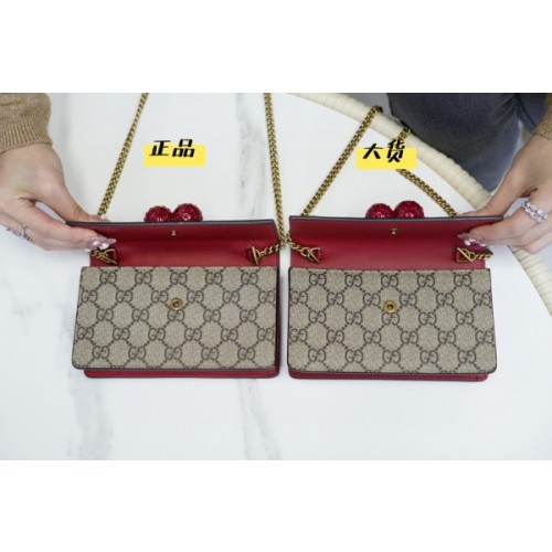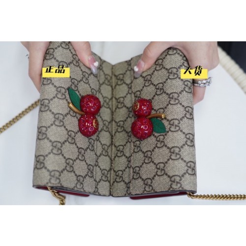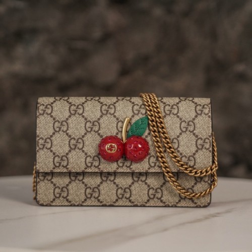 친환경 GG 수프림 캔버스 미니 체인백. 크리스털을 아로새긴 재치있는 3차원 체리 장식.
