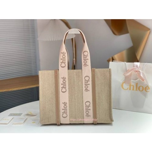 리넨 캔버스, 카프스킨 & 끌로에 로고 자수 웨빙 토트백
